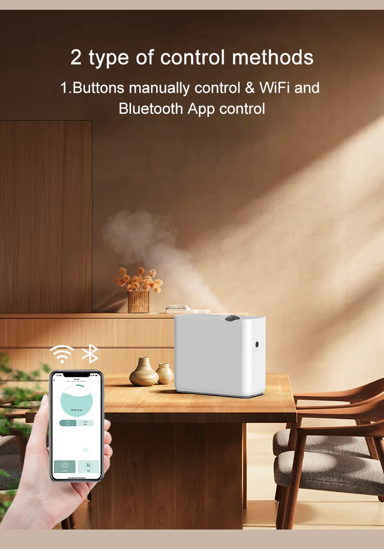 2. This classic aroma diffuser can be controlled via an acrylic touchscreen button, and remotely controlled via the Aroma-Link mobile app using Wi-Fi and Bluetooth.
